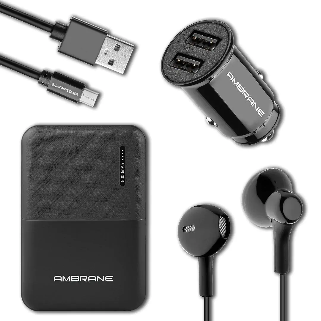 This kit is made for the people who are always on the go and require that extended battery life. The kit compromises of a 5000mAh powerbank to charge your phone anytime and anywhere along with Micro USB cable for charging and a Dual Port Car Charger, so that your devices never run out of battery, it also has wired earphones for listening purposes. This power packed kit comes with the guarantee of Ambrane so that you can use your mobile smoothly without any inconvenience.