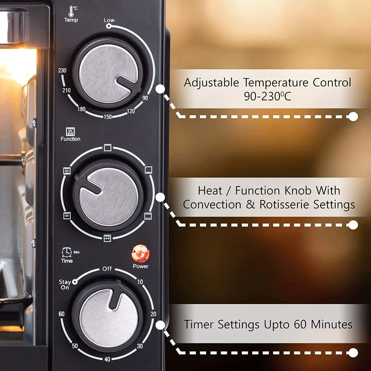 60 Litres Capacity - 3 Heating Modes - Rotisserie with Convection - Adjustable temp from 90-250C - Adjustable timer up to 90 mins with stay on function - Includes: Bake pan, screwk er rack, crumb tray, rotis serie handle, tray handle, rotisserie fork - 1 year warranty