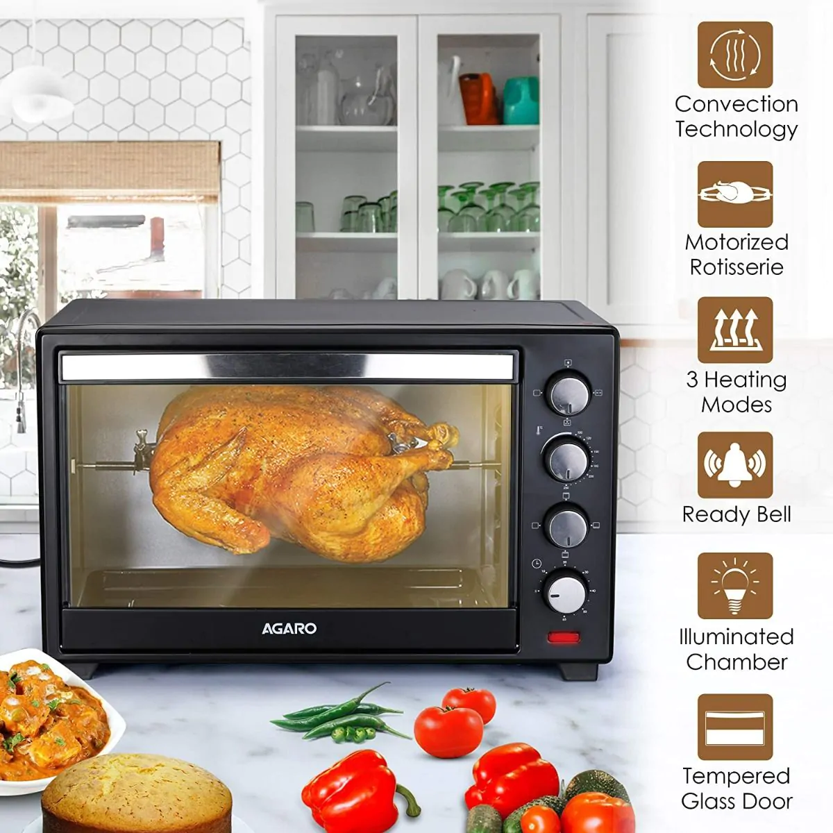 6 Heating Modes - Motorized rotisserie and convection function - Adjustable temperature from 90?C to 230?C - 60 mins timer with stay on function - Includes: Bake Pan, Grill Plate, Crumb Tray, rotisserie handle, tray handle, rotisserie rod - 1 Year warranty